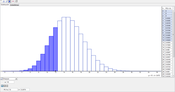 Tiene un parámetro lambda que indica la cantidad de sucesos esperados en el tiempo o superficie que estamos estudiando. Su función de probabilidad es esta: