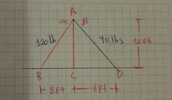 El cable A-B y el cable A-D ayudan a sostener al poste A-C, si se sabe que A-B tiene una tensión de 120 libras y A-D de 40 libras determine la magnitud y dirección de la resultante de las fuerzas ejercidas.