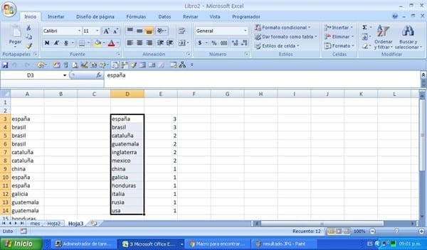 Necesito encontrar los duplicados de una lista que se encuentra en la cololumna A y que el resultado me lo coloque en la columna D (nombre de los articulos) y E (cantidad de veces que esta el articulo)