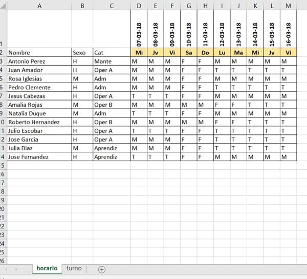 Como veis en el ejemplo en la hoja “turno” quiero introducir la Fecha i el turno. I que me muestre todas la filas de la hoja “horario” que coincida fecha y horari. Así sabre que que trabajaores hay en ese turno.