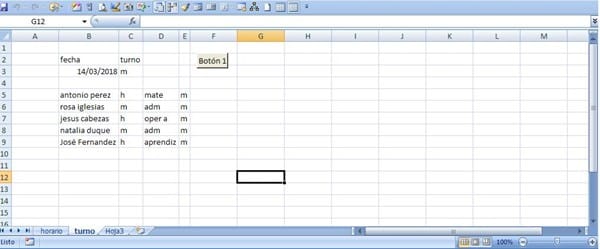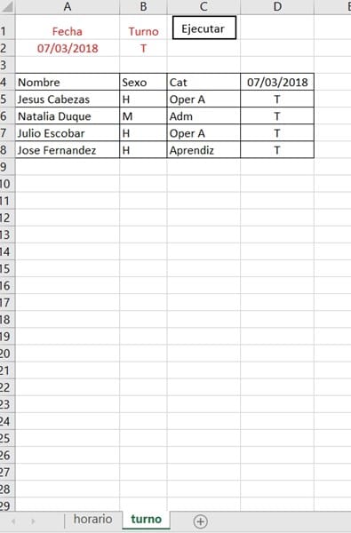 Tengo una hoja “horario” y quisiera hacer una doble consulta i mostrar el resultado en otro hoja “turno”.