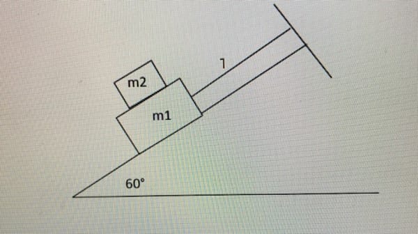 5.- Una masa m1 = 60 kg, se mantiene en posición mediante una cuerda a lo largo de un plano inclinado, tal como muestra la figura. Calcule la tensión de la cuerda y la fuerza ejercida por el plano sobre la masa m1 si m2 = 16 kg. Sol: 509,22 N; 372,4 N.