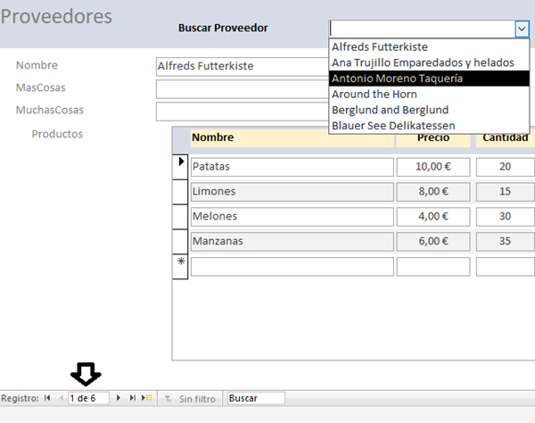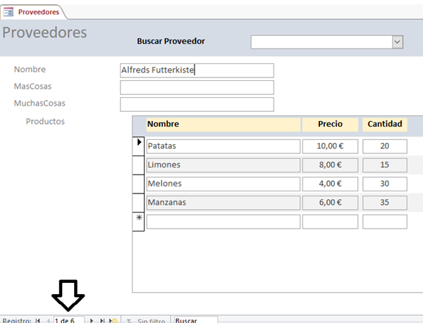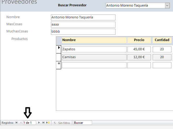 Te digo como puedes hacerlo, aunque yo no lo haría así, pero... Supongamos que tengo una tabla Proveedores con IdProveedor, nombre, etc y una tabla Productos con IdProducto, Idproveedor(para relacionarla con la anterior uno a varios UN PROVEEDOR-PROPORCIONA VARIOS PRODUCTOS) y construyo un formulario con subformulario, como en la imagen, donde a cada proveedor le asigno los producto que proporciona, precios y cantidades que le compramos, etc.