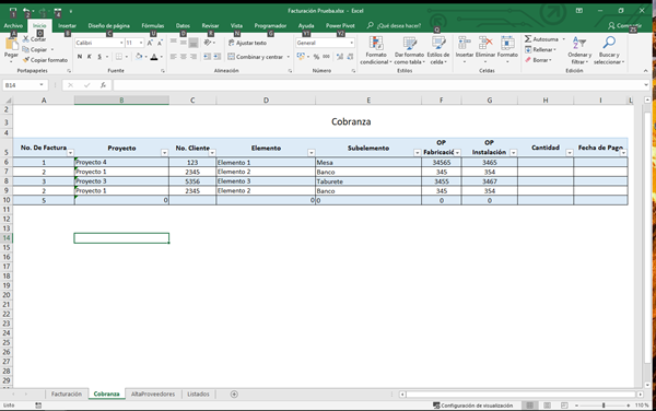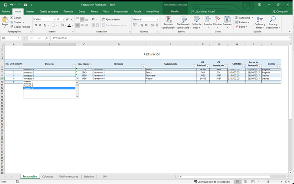 Columna B: Contiene un listado de validación de datos, únicamente seleccionas (es importante señalar que la información de la validación de datos se alimenta de la hoja llamada listados y a su vez la hoja de listados se alimenta de otro archivo llamado Proyectos, conforme van aumentando los proyectos se actualiza la hoja de listados y a su vez va actualizando la validación de datos de la hoja de Facturación.)
