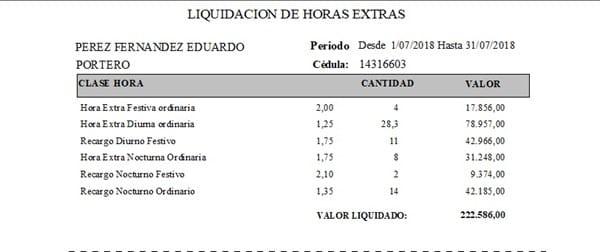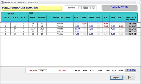 Observe como se muestran en rojo los días dominicales y festivos y en la columna ENTRA del día 3 aparece que el vigilante ingreso al turno a las 20 horas y en la columna SALE columna DIA aparece que sale el día 4 de julio a las 22,30 horas y en la columna LABORO 26,3. Por último se obtiene el reporte de la liquidación del turno y el costo de las horas extras.