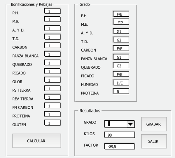 Tengo un formulario de VBA para cargar los valores de un análisis (Cuadro bonificaciones y rebajas). Según los valores que yo cargue, el formulario categorizará al rubro (ph - me - TD - entre otros) en 4 categorías (G1 - G2 - G3 - F/E). (Cuadro de Grados)