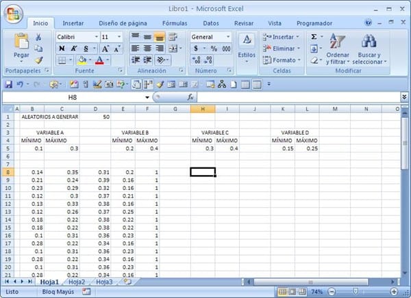 Necesito generar números aleatorios, ya sea en excel (preferencia) o matlab. Por ejemplo, se tiene como variable A, B y C, necesito que la suma de estas sume 1 (100%), pero además, con la condición de que A varíe entre 0.2 y 0.3, B varíe entre 0.5 y 0.3 y C varíe entre 0.3 y 0.4 {esto por dar un ejemplo}. Necesito que se generen por lo menos 50 combinaciones posibles (desconozco si al poner la condición de que se pueda como máximo 4 decimales lo complique más). Estaré muy agradecido de su ayuda!