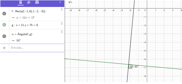 $$\begin{align}&M_1=\frac{-5-6}{-2-(-1)}=11\\&\\&\end{align}$$Pendiente recta perpendicular