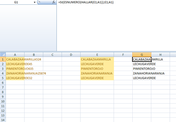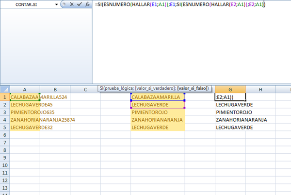 Quisiera saber si se puede hacer una fórmula =SI(ESNUMERO(HALLAR(E1;A1));E1;A1) Imagen 1