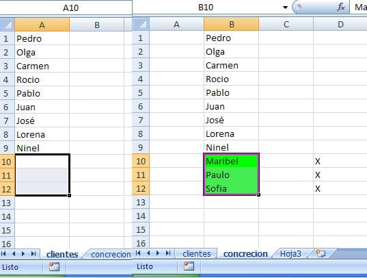 El procedimiento que necesito implementar, consiste en verificar la existencia de los códigos de clientes, ubicados en la columna “B” de la hoja “concrecion”, en la columna “A” de la hoja “clientes”. Si estos no aparecen en la hoja “clientes”, necesito insertar un indicador en la hoja “concreción”, para este caso, una “X” en la misma fila, columna “D”, por cada código que no se encuentre en la hoja “clientes”.