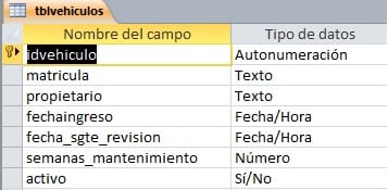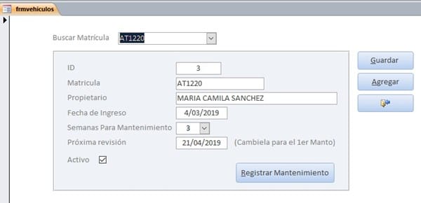 Esta tabla contiene la información básica del vehículo y permite ver la fecha del próximo mantenimiento. Igualmente permite activarlo y desactivarlo para impedir el registro de un mantenimiento.