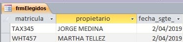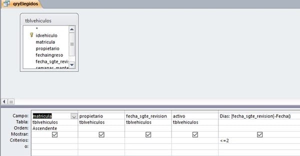 Esta consulta selecciona los vehículos cuya fecha de reparación sea 2 días siguientes a la fecha del sistema y es el origen de datos del formulario elegidos.