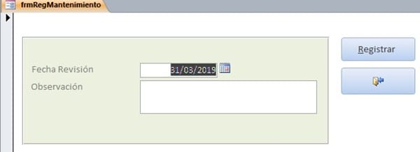 Este formulario solo se activa desde el formulario de vehículos. Por defecto se fija la fecha del sistema, en el campo observación se anota el mantenimiento realizado. Cuando haga clic sobre el botón "Registrar", se registra el movimiento y actualiza el campo fecha_sgte_revision de la tabla vehículos con base en el número de semanas que se haya parametrizado para el vehículo.