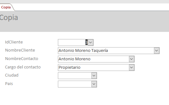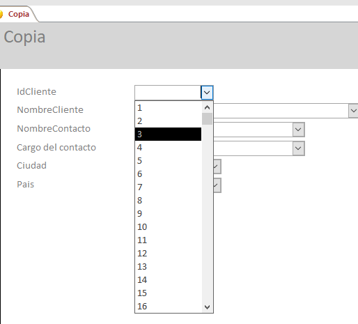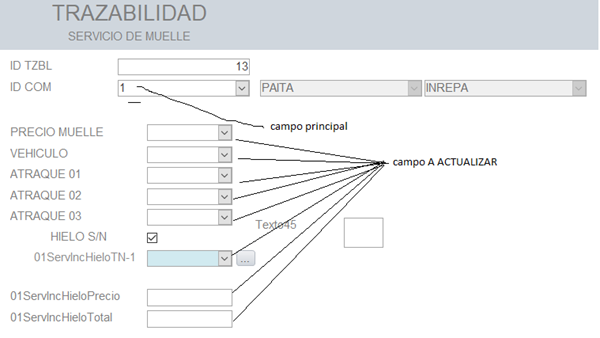 El formulario que estoy utilizando, jala los datos de otra tabla, lo que quiero, es que al elegir, el dato, cuadro combinado principal (ID COM), los demás campos se actualicen automáticamente.