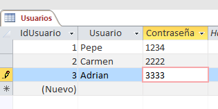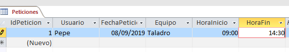 Y una tabla Peticiones donde, para el ejemplo, ya le he añadido un registro. Fíjate en las horas