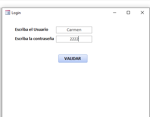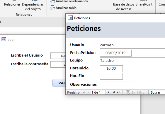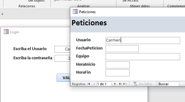 Escribo el usuario y la contraseña y pulso Validar. Como el usuario y la clave son correctas abre en vista diálogo el formulario Peticiones, con el nombre del usuario