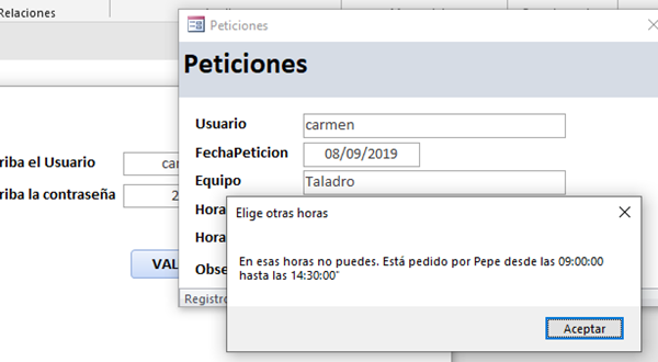 Como puedes ver carmen ha pedido el taladro el mismo día y a una hora que está "ocupada" por Pepe. Cuando pulso Enter