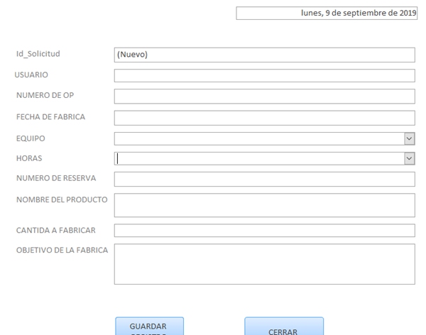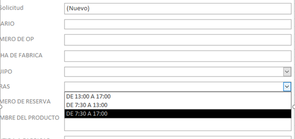 Estoy haciendo una base de datos la cual consiste en programar equipos para fabricar. En donde cada usuario ingresa y programa el equipo, fecha y hora (para hora se maneja de 7.30 a 13, 13 a17, 7.30 a 17).