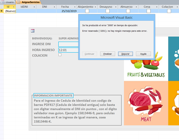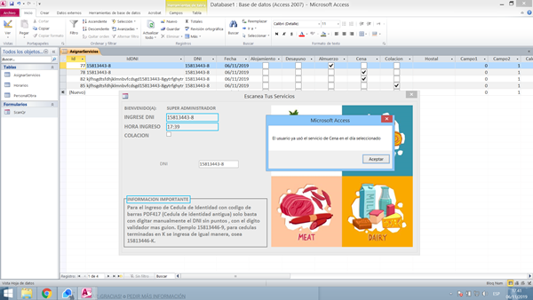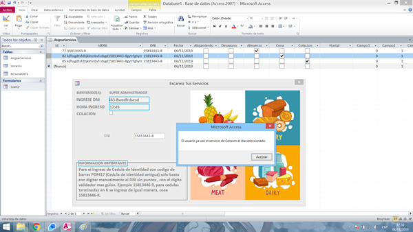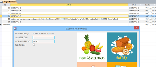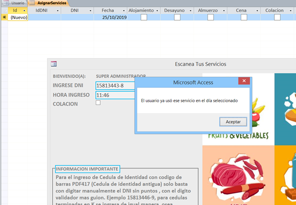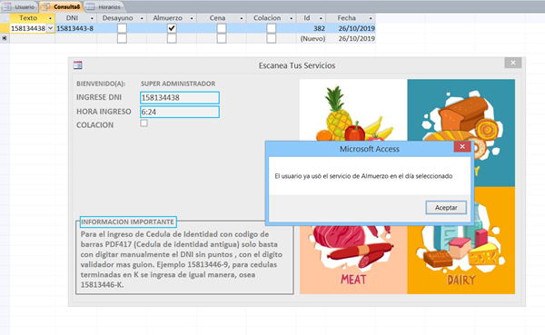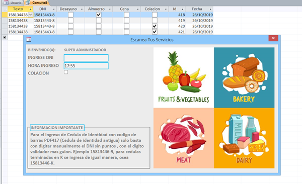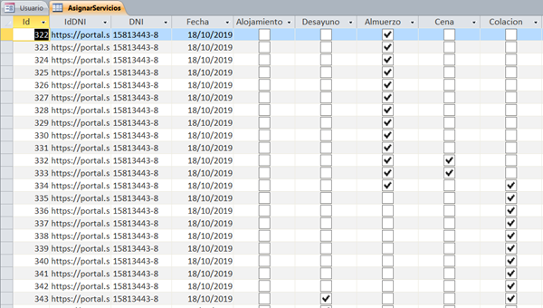Bueno cuento con el siguiente formulario que esta enfocado en la carga de servicio a un restaurante el cual carga los registros por medio del dni insertado por pistola de código de barras. La cual carga los servicios de Desayuno, Almuerzo, Cena y Colación. Todos estos se van asociando automáticamente a un campo bolean correspondiente dependiendo de la hora que sea, excepto colación que se activa por intervención del usuario ya que es variable.