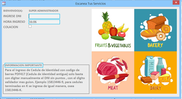 y bueno con respecto al formulario los únicos campos que manipula el usuario es dni (que se inserta con la pistola de codigo de barras) y el bolean de "colación" que se ve en la imagen que se utiliza cuando el usuario no quiere almuerzo y en cambio pide una colación.