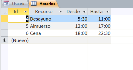 If Hora >= DLookup("Desde", "Horarios", "Recurso=""Desayuno""") And Hora <= DLookup("Hasta", "Horarios", "Recurso=""Desayuno""") Then