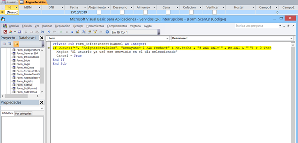 If DCount("*","AsignarServicios","Desayuno=-1 AND Fecha=#" & Me.Fecha & "# AND DNI='" & Me.DNI & "'")>0 Thenluego las lineas que sigan al Then dependerán de en qué evento lo pongas, algo que no tengo claro al no saber cómo funciona tu formulario.