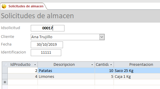 Así, si tengo el formulario Solicitudes de almacen