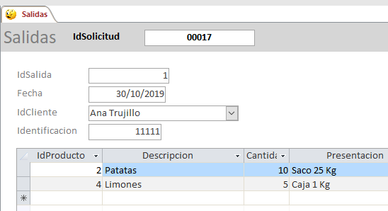 Es decir, al escribir el idsolicitud, lo que hace es buscar los valores en la tabla Solicitudes... y los "pone" en sus cuadros de texto, y como este formulario depende de la tabla Salidas, ya te lo guarda. Luego inserta en la tabla Detallesalida aquellos valores de la tabla DetalleSolicitud en que el idsolicitud sea igual al que hay en el formulario.