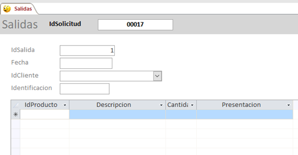 En el formulario Salidas( el otro está cerrado, ya que no hace falta que esté abierto) escribo ese idsolicitud
