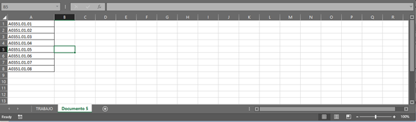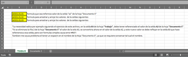 Lo que pretendo es por decir, con la hoja que tiene los datos de referencia("Documento 5" en nuestro ejemplo) generer otras hojas que tomen los valores de ciertas celdas en consecutivo, por ejemplo tengo una 2da hoja de nombre "TRABAJO", la cual necesto que a apartir de la celda B1 hasta la B800, tome los valores de la hoja "Documento 5" de la celda A1 hasta la A800, como son muchas por eso busco que se arrastre.