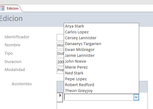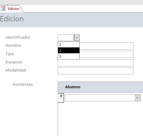 Tabla nº2 (Ediciones de cursos): quiero que cuando desde un desplegable seleccione el Identificador (Tabla nº1) se autorellenen el resto de campos asociados (de la Tabla nº1) y poder rellenar otros datos. La intención es rellenar la Tabla nº2 con los datos de la Tabla nº1 pero nunca modificarlos. Me gustaría poder rellenar la tabla desde un formulario.