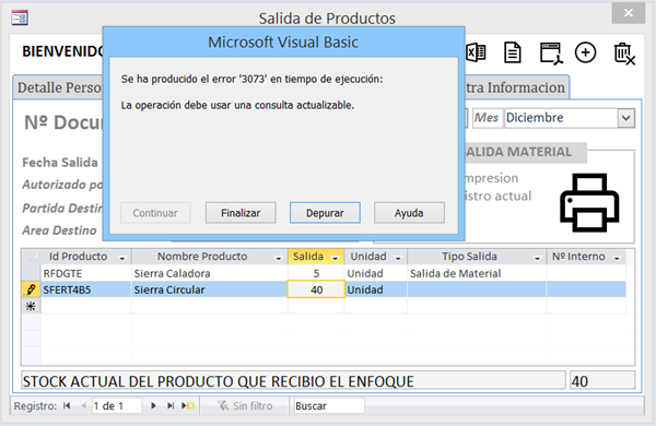 Restar el valor del campo "salida" del id Producto "SFERT4B5" (subformulario)al mismo producto SFERT4B5 el valor que se encuentra en el campo "Stock" (consulta). Por lo tanto si esto llegase a dar un valor negativo arrojara un cuadro de mensaje que dirá "si realizas esta salida el stock de este producto quedara con valor negativo. Quieres continuar?". Con alternativa SI o NO
