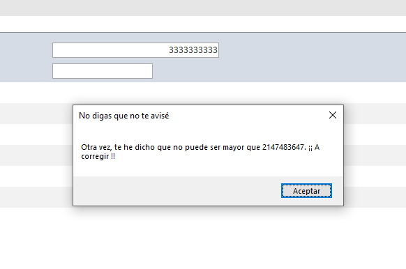 Rem código para controlar que el valor digitado no sea <= a 0 y que no sea > 2’147.483.647