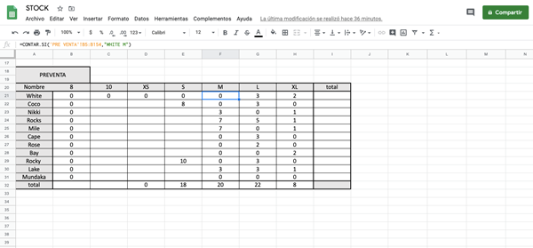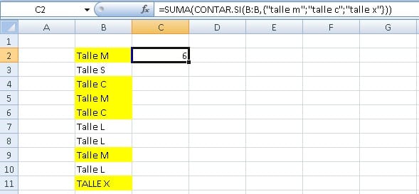 Supuestamente en dichas celdas de la columna, tengo formato texto. La función la escribo como =CONTAR. SI(B:B;"Talle M"), tomando como rango la columna B y cómo criterio que aparezca escrito "talle m", y soy consciente de que esta función no distingue entre mayusculas o minúscula. Ahora, yo quiero contar varias celdas, con distintos criterios, no solo "Talle M", sino que distintos nombres y distintos talles también, y cada uno en una celda distinta. Me refiero a que por cada celda escribo una función contar.si .