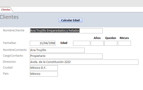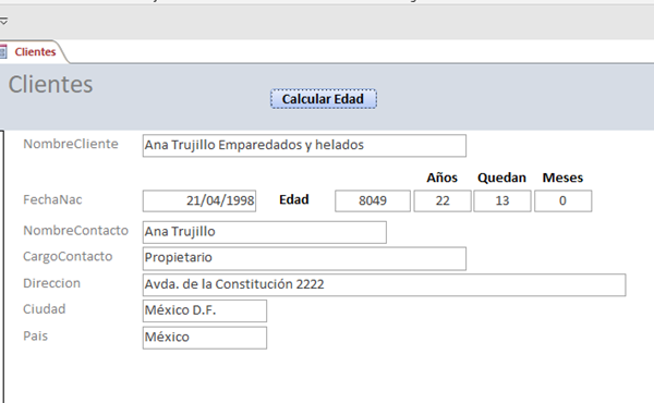 @Sveinbjorn El Rojo hola. Que tal, si lo que deseo es que tengo una base de datos de pacientes y deseo calcular la edad en un solo cuadro de texto que diga en años y meses. En mi tabla tengo un dato de FN_paciente y otro edad_paciente. Solo calculaba la edad por una macro pero la base también tiene niños de menos de un año y sale 0 de edad.Por cierto, si necesito que se grave en una tabla a pesar que sea cambiante. Porque los expedientes se fijan en el año que tenia cumplido al momento de la atención. ¿Debería poner los nombres tal cual ud me los esta dando? He intentado como ud me dijo pero me sale error