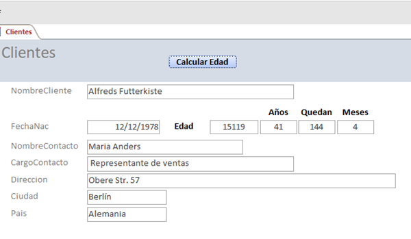 Private Sub Comando17_Click() Edad = Date - FechaNac Años = Fix((Date - FechaNac) / 365.24) Quedan = Int(Edad - Años * 365.24) Meses = Fix(Quedan / 30.24) End Sub
