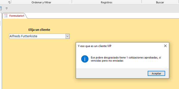 MsgBox "Ese pobre desgraciado tiene " & i & " cotizaciones aprobadas, sí vencidas pero no enviadas", vbokoonly + vbInformation, "Y eso que es un cliente VIP"