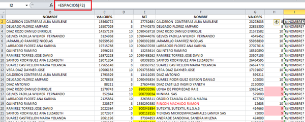 La presentes para saber si se puede crear una macro que elimine mas de 2 espacios entre nombres, si los tiene. En la columna F tengo varios nombres que estan separados por mas de 2 espacios entre nombres. Por ejemplo DELGADO FLOREZ AMPARO entre DELGADO y FLOREZ hay 2 espacios con barra espaciadora, quiero queden de uno.