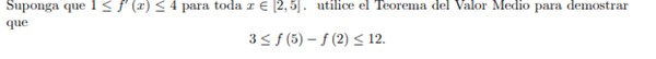 Pero por el teorema del valor medio, sustituyendo los extremos por sus valores numéricos tenemos1<(f(5)-f(2))/(5-2)< 4. Yo no sustitui los extremos, deje que la persona lo hiciera. Pero a partir de ahí, 5-2 = 3, y multiplicando la desigualdad nos queda en 3<f(5)-f(2)<12 - Alejandro Salazar