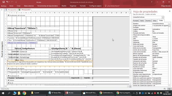 Como podéis ver, es un informe para generar una factura y un presupuesto, depende de qué opción elija. Cuando es presupuesto, quiero que aumente el alto del encabezado del informe, y mueva ese cuadro de texto (que deberá mostrar porque está oculto); pero cuando sea una factura, que no lo muestre.