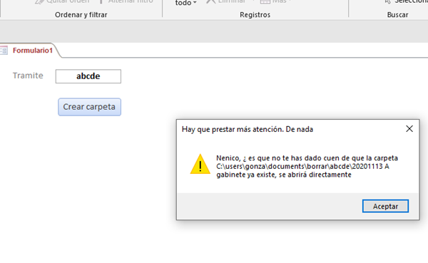 MsgBox "Nenico, ¿ es que no te has dado cuen de que la carpeta " & ruta & " ya existe, se abrirá directamente", vbOKOnly + vbExclamation, "Hay que prestar más atención. De nada"