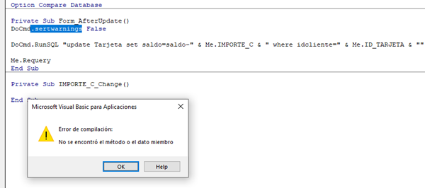 Quisiera poder actualizar, al introducir el IMPORTE en el formulario, el campo SALDO de la tabla TARJETAS y mostrarlo actualizado en el formulario