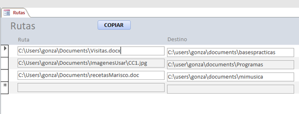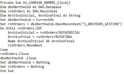 Me gustaría cambiar de nombre y de ubicación los archivos alojados en una carpeta. Las rutas iniciales y finales las tengo en una tabla de Access. Visualizo los datos a través de una consulta y ejecuto el código desde un botón de formulario.