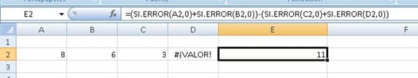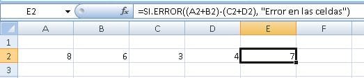 =SI.ERROR((A2+B2)-(C2+D2), "Error en las celdas")