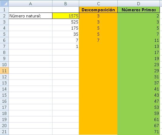 2. En la columna D desde la celda D2 y hacia abajo pon los números primos, todos los que desees. En mi ejemplo, puse hasta el 71, hasta la celda D21