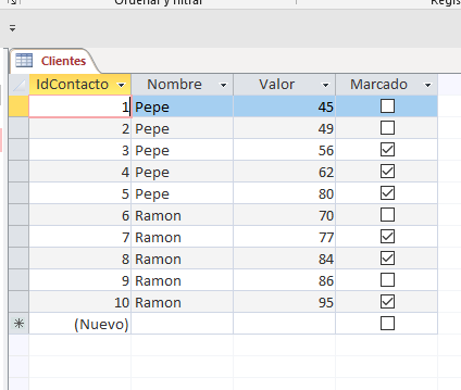 Tengo una bd (Access 2007) con una tabla con los campos NOMBRE (texto), VALOR (entero) y MARCADO (si/no). Dicha tabla se obtiene mediante una consulta y está ordenada por nombre y por valor.