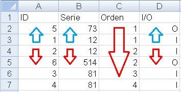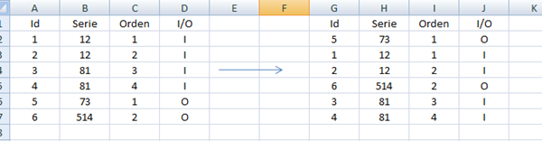 Estoy intentando con una macro ordenar una tabla por serie, orden de entrada y tipo In/Out. He probado de mil maneras, pero no consigo llegar al resultado. Como figura en la foto. Lo estoy haciendo como siempre. El problema es que no estoy usando la lógica correcta. ¿Alguna sugerencia? No doy con ello.