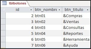 En el campo btn_nombre se registra el nombre del botón del formulario y en el campo btn_titulo, el título que se va a fijar en el botón del formulario, observe el & es para que al pulsar el formulario la tecla ALT + primera letra se ejecute un procedimiento.