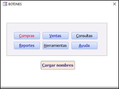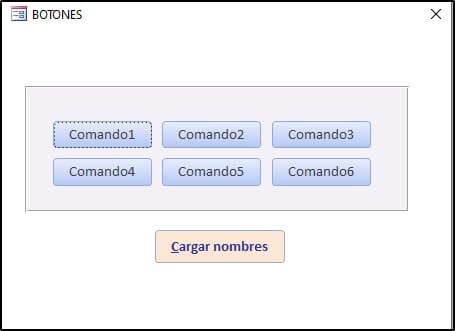 Al abrir el formulario aparecen los 6 botones con el nombre que asigna Access por defecto, cada botón tiene el nombre btn01, btn02, ... hasta btn06, son los mismos que están en la tabla columna btn_nombre. Al hacer clic en el botón Cargar nombres, obtengo: