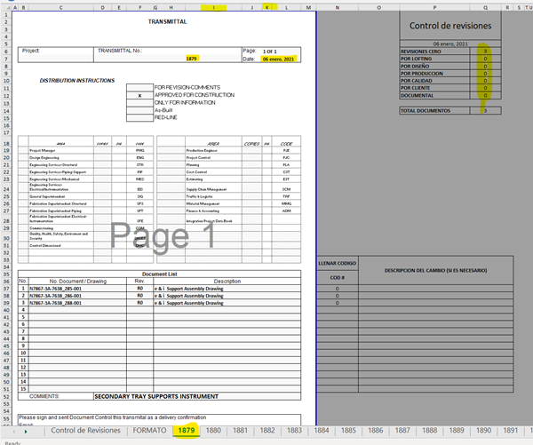 En mi libro llamado "TRANSMITTAL", tengo una pestaña llamada "Control de Revisiones", aquí es donde vacío la información de los reportes (pestaña nueva) que se van agregando en este mismo libro, el formato de cada reporte es un templete predefinido y se realiza de forma numérica consecutiva, para cada reporte.